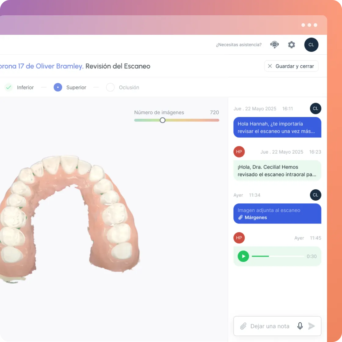 Aumente la precisión del escaneado y la eficacia clínica. Reciba información inmediata y experta del equipo de Godent mientras escanea imágenes intraorales. La información en directo permite la resolución instantánea de problemas, con el paciente todavía en el sillón. Esta revisión proactiva garantiza exploraciones de gran precisión, lo que reduce significativamente las reexploraciones innecesarias y acelera la resolución de casos. Aumenta la productividad y la satisfacción del paciente.